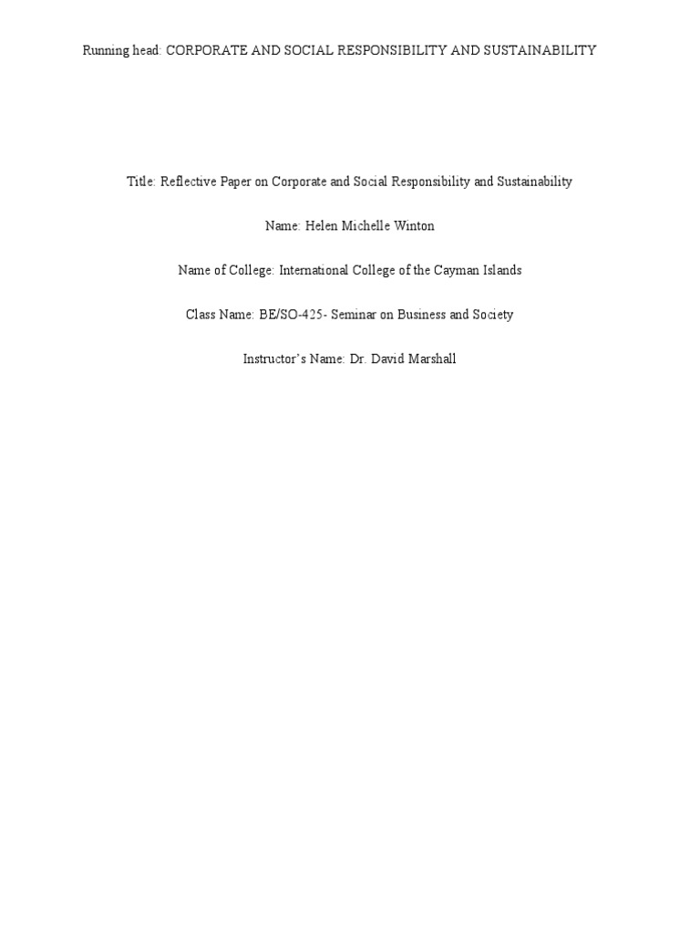 It is of no use when a company invests towards environmental sustainability but the public is not aware of the steps taken towards environmental sustainability. This is because, in the modern times, the perception of the public concerning the environmental sustainability of a business enterprise also determines their willingness to purchase from the company It's a Relective essay of The subject: Sustainability and Social Responsibility. The completed reflective essay providing a reflection on your learning in some chosen themes of the course. The attached files contains two essay example in different style. So all in all,just a general essay on the topic of sustainability and social responsibility Personally, I recycle, re-use and make informed decisions to minimize waste. In my organisation, my manager and I, alongside four other colleagues, have also started a sustainability work group, which meets once a month to discuss office sustainability opportunities and work with the wider business to implement change
